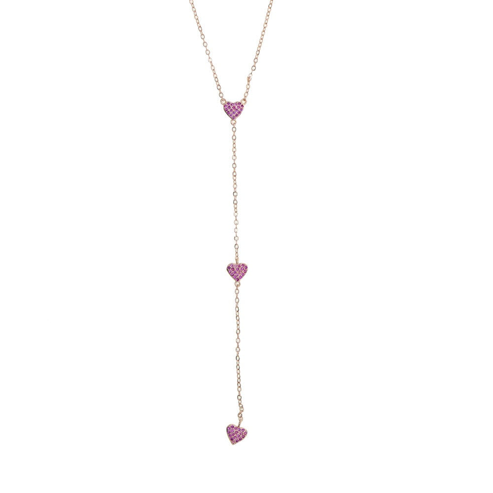 A dainty pink heart drop necklace with three heart-shaped cubic zirconia stones placed along a sleek rose gold chain. Lightweight, sparkly and perfect for everyday wear or layering with your favourite chains.