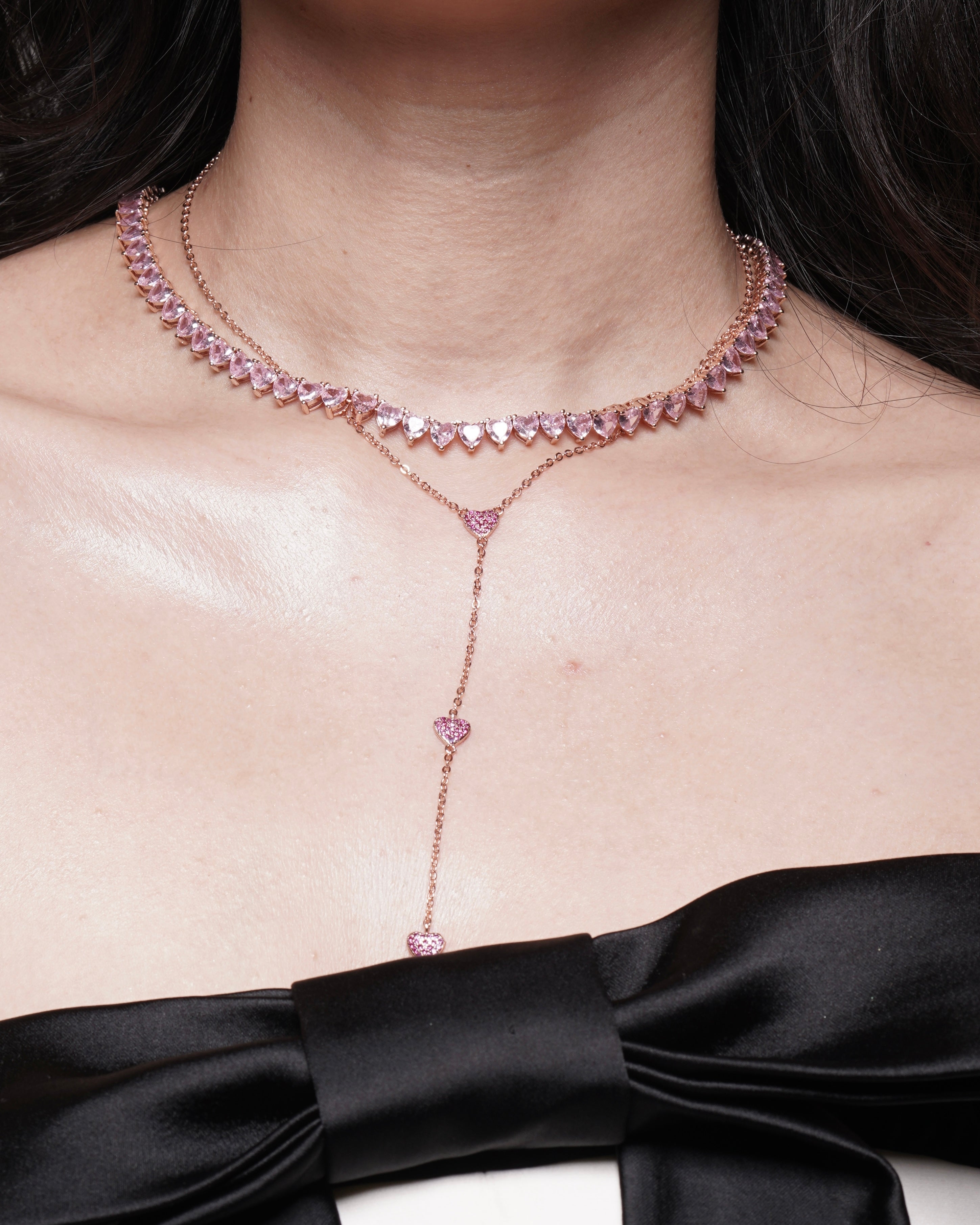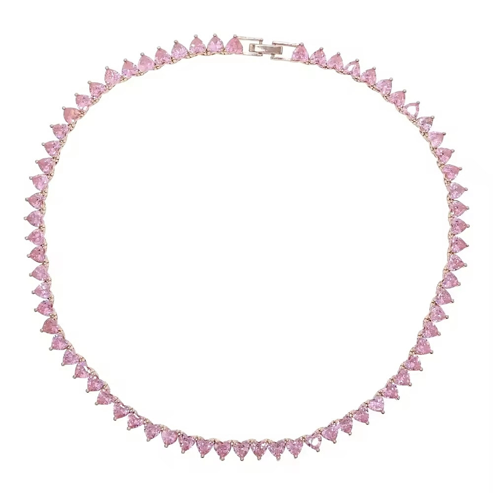 A playful take on the classic tennis necklace, this piece features precision-set 5A pink heart-cut cubic zirconia in a sleek, continuous silhouette. Crafted on a brass base with rose-gold plating and a fold-over clasp closure, it sits perfectly along the neckline and catches light from every angle.